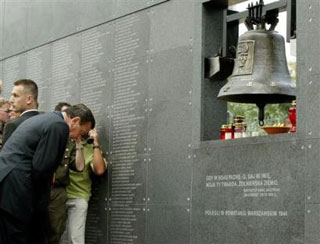 He bowed on the steps of the Warsaw Uprising Memorial as a lone trumpeter played taps. Just before, sirens sounded across Warsaw at 5 p.m., the hour the uprising began on Aug. 1, 1944.