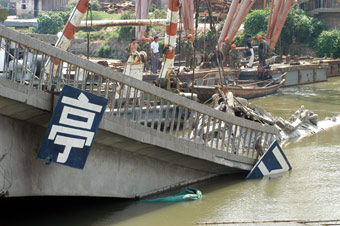 The local maritime affairs authorities were still busy cleaning up the remains of the bridge in order to restore the traffic order along the waterway, Zhou Baolin, an official with the Suzhou Maritime Safety Administration told China Daily Thursday. The two sunken boats were still not pulled out by the press time Thursday. The cause of the accident is still under investigation and sources with the local maritime safety administration told China Daily the accident might have happened when a boat train carrying coal bumped into the pier along the bridge to avoid a head-on collision with another boat. The Beijing-Hangzhou Grand Canal would not be completely obstructed since the canal has some other branches. The 1,764-kilometre-long Beijing-Hangzhou Grand Canal, whose construction was completed in 610 DC in the Sui Dynasty (581-618 DC), is the world's oldest and longest manmade waterway. |