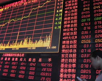 A Chinese woman makes a phone call at a stock exchange Monday in Shanghai. China's stocks continued to soar for the fifth consecutive day Monday. [newsphoto]