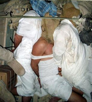 Some of the photos recall aspects of the images from Abu Ghraib, which led to charges against seven soldiers accused of humiliating and assaulting prisoners. In several of the photos obtained by the AP, grinning men wearing U.S. flags on their uniforms, and one with a tattoo of a SEAL trident, take turns sitting or lying atop what appear to be three hooded and handcuffed men in the bed of a pickup truck.