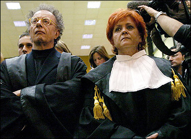 State prosecutors Gherardo Colombo (L) and Ilda Boccassini listen to court chairman Francesco Castellano as he reads the judgement after Milan's court quashed corruption charges against Italian Prime Mister Silvio Berlusconi. [AFP]