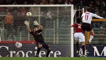 Argentina striker Hernan Crespo put Milan in the lead by out-leaping defender Christian Panucci for a header in the 63rd minute. Seven minutes later, Crespo sent another header toward Roma's goal and Panucci intercepted the ball with his arm. The play earned Panucci a red card, reducing his side to 10 men, and awarded Milan a penalty kick that Andrea Pirlo converted. Roma ended with only nine men when captain Francesco Totti picked up his second yellow card in the 90th. The loss was a sour debut for Roma coach Bruno Conti, the team's fourth manager this season. The previous coach, Luigi Del Neri, resigned after a loss to Cagliari last weekend. Juventus beat Reggina 1-0 on Saturday with a 65th-minute winner by captain Alessandro Del Piero. Both Juventus and Milan have 66 points. Earlier Sunday, Inter Milan took over sole possession of third place after beating Fiorentina 3-2, but may have lost Brazilian striker Adriano to injury. Inter is in third place with 50 points, followed by Udinese with 48 and Sampdoria with 47. The top four teams at the end of the season earn Champions League berths. At San Siro, Argentine midfielders Esteban Cambiasso and Juan Sebastian Veron scored a goal each and Colombian defender Ivan Cordoba added the third for Inter. But Cordoba also scored an own-goal for Fiorentina three minutes before the end to make for a tense finish at San Siro. Fiorentina forward Gianpaolo Pazzini temporarily leveled the match at 1-1 in the 40th. Adriano strained his right knee in a 38th-minute collision with Fiorentina midfielder Enzo Maresca. After receiving treatment for several minutes while lying down on the turf, the Brazilian was carried off the field on a golf cart. "I hope it's nothing major, it's too soon to say for sure," Inter coach Roberto Mancini said. On Tuesday, Adriano's hat trick allowed Inter to eliminate defending champion FC Porto from the Champions League. Inter faces city rival Milan in the quarterfinals of the European competition on April 6 and 12. "I can't say now if he'll play in the Champions League derby. Fortunately there is a break now," Mancini said, referring to the upcoming league break for national team play. In Udine, David Di Michele scored an 88th-minute match-winner, his second goal of the day, in Udinese's 2-1 win over 10-man Lecce. Sampdoria, which entered the day tied for third with Inter, lost 2-1 at home to last-place Atalanta, which got goals from 21-year-old Nigerian revelation Ayodele Makinwa and Cesare Natali. Makinwa now leads Atalanta with five goals in nine matches since being transferred from Serie B leader Genoa in January. Also Sunday, nine-man Parma drew 3-3 with Palermo on Alberto Gilardino's injury-time equalizer, boosting the clubs hopes of avoiding relegation. Gilardino also scored a penalty, as did Italy teammate Luca Toni for Palermo, while Italy coach Marcello Lippi looked on. Later Sunday, Lippi included Gilardino and Toni on Italy's roster for a World Cup qualifier against Scotland at San Siro next Saturday. Cagliari's Uruguayan striker Nelson Abeijon equalized in extra time of a 3-3 draw at 10-man Livorno, gaining the Sardinian side only its seventh point on the road this season. Elsewhere, Chievo Verona beat Brescia 3-1 on two goals by Sergio Pellissier, and Bologna played to a 0-0 draw at Messina. In Saturday's other match, Igor Tudor headed in the decider to lead Siena over Lazio 1-0 for its first Serie A win in a month.