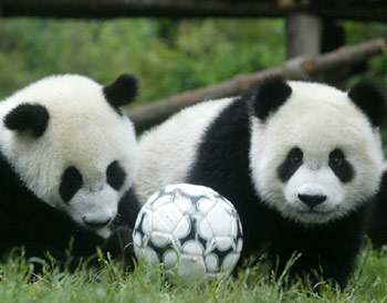 Pandas play soccer in the Giant Panda Breeding Center in South West China's Sichuan Province June 3, 2005. The pair of giant pandas to be sent to Taiwan as gifts will be selected from the center. [newsphoto]