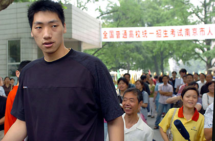 Tang Zhengdong, the Most Valuable Player of the Chinese Basketball Association (CBA) in 03-04 season, walks out walk out of an exam building after finishing the first exam in Nanjing, Jiangsu Province, June 7, 2005. The 212-centimeter-high Jiangsu Tongxi center is the tallest examinee in the Province. [Xinhua] |