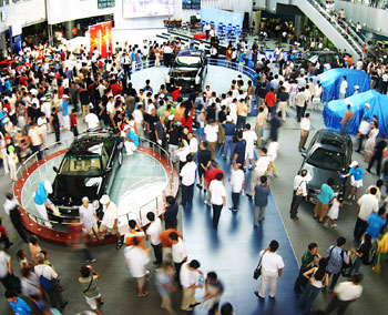 Visitors look at vehicles on display at an auto exhibition in Changchun, Northeast China's Jilin Province August 4, 2005. Some 650 vehicles will be shown during the exhibition which lasts from August 4 to 14. [newsphoto]