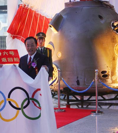An official displays an International Olympic Committee flag retrieved from the re-entry capsule of the Shenzhou VI spacecraft Wednesday October 19, 2005 in Beijing. Sixty-four articles were retrieved, including a national flag that marched with Chinese scientists on a polar expedition, a flag for the 2010 Shanghai Expo, stamps and art works by children and noted Chinese artists. The capsule, carrying taikonauts Fei Junlong and Nie Haisheng, landed on the Earth Monday, marking the success of China's second manned space mission. [newsphoto]