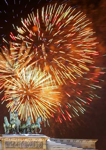 Fireworks explode over the Quadriga on top of