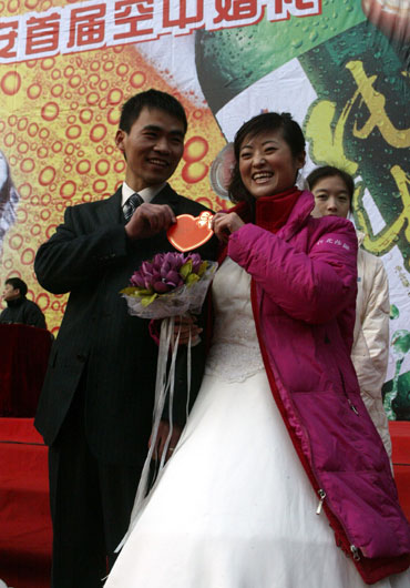 The couple greets the audience, holding a red heart, at the wedding ceremony. [newsphoto]