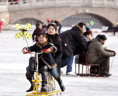 People play on the frozen Shichahai Lake in Beijing Monday enjoying the New Year holiday. [Xinhua]