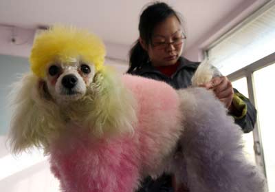 and purple dye, has its hair trimmed at a pet beautician school in Beijing