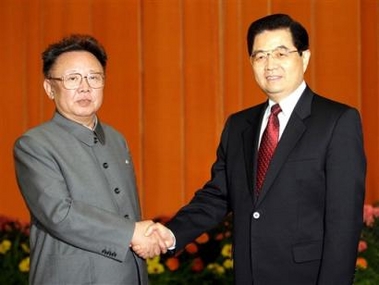 hands with North Korean leader Kim Jong Il, left, at Beijing's Great Hall