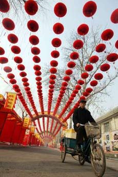 A Chinese man rides his tricycle under red lanterns at a temple fair for the upcoming Spring Festival at a park in Beijing January 26, 2006. Spring Festival, also known as the Lunar New Year, falls on January 29 this year. [Reuters]