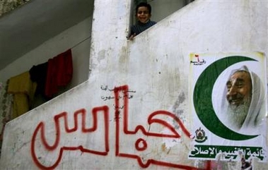 reads in Arabic 'Hamas' and a poster showing the late Hamas leader and