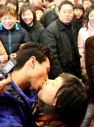 A Chinese couple kisses during a kissing contest to celebrate the Valentine's Day at a shopping mall in Jilin, Northeast China's Jilin Province February 14, 2006. [Newsphoto]