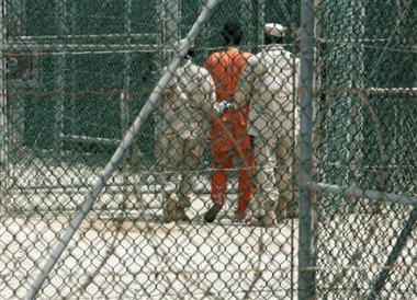 detainee is escorted by two military guards at Camp Delta, at Guantanamo