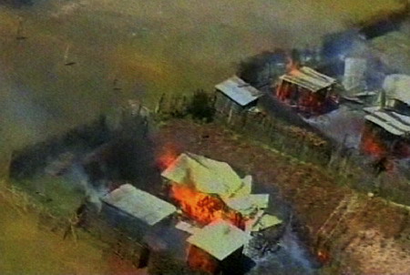 A TV frame grab taken on January 1, 2008 shows aerial footage of the area where a church was attacked near Eldoret, some 310 km (193 miles) northwest of Nairobi. A mob torched a Kenyan church on Tuesday, killing about 35 villagers cowering inside, as the death toll from ethnic riots triggered by President Mwai Kibaki's disputed re-election soared to at least 180. [Agencies]