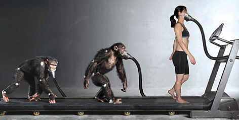 四名人類志愿者以及五只黑猩猩作為研究對象。通過測量他們在跑步機上行進過程中消耗的氧氣和運用的力量,計算他們各自所耗費的能量。結(jié)果發(fā)現(xiàn)人靠兩足行走的步法比黑猩猩四肢行走的步法要節(jié)省75%的能量。