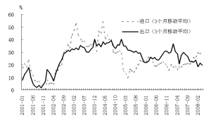 圖2 進出口同比增速3個月移動平均值的變化趨勢