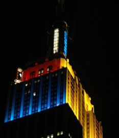 從日落亮燈至午夜,帝國大廈8月13日的東南西北四面分別亮起西班牙、烏克蘭、斯洛文尼亞和古巴四國的國旗顏色燈光。(歐葉)