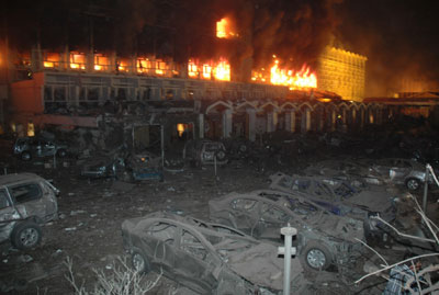據(jù)警方初步調(diào)查,一輛裝載炸藥的汽車在沖向萬豪酒店門口后爆炸。由于爆炸威力巨大,包括大堂在內(nèi)的酒店主體建筑被毀,酒店大部分建筑起火,酒店附近的幾個(gè)建筑物也不同程度受損。