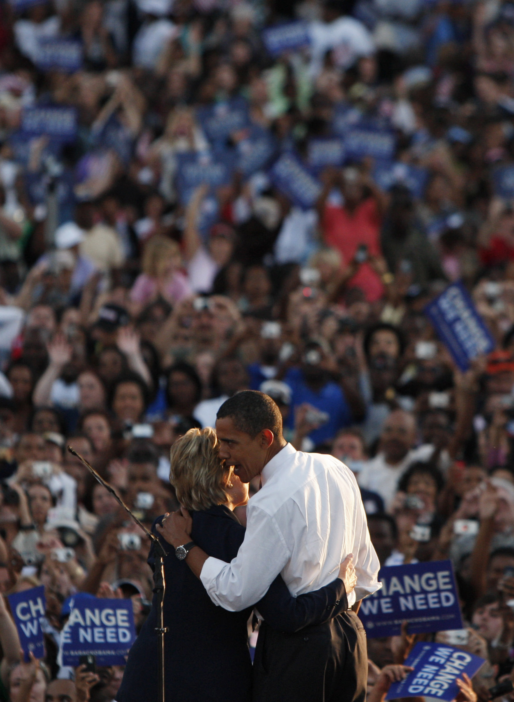 10月20日,美國民主黨總統候選人奧巴馬(左)和參議員希拉里·克林頓在佛羅里達州奧蘭多市參加競選活動。當天,佛州選民開始提前舉行大選投票。(英國媒體圖片)
