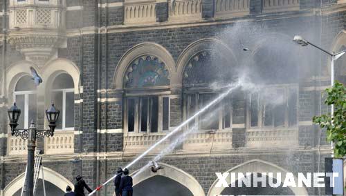 圖為消防人員在孟買泰姬瑪哈酒店外滅火 2008年11月29日 印度軍方宣布在孟買泰姬瑪哈酒店的清剿行動已經結束 新華社王曄攝