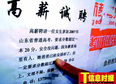 近日,廣州某高校飯堂門口宣傳板上驚現了一則這樣的廣告:高薪聘請一位女生參加2007年山東省普通高考,要求分數超過重點本科20分,安全沒有問題,因為教育局里有人,她爸爸已經安排好了,但一定要求分數超過重點線20分以上,文理不限,報酬一萬元。