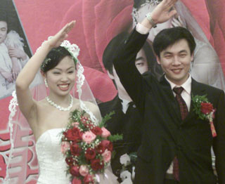 Tianjin, wave at their wedding on May 1, 2004. Wang is reportedly the