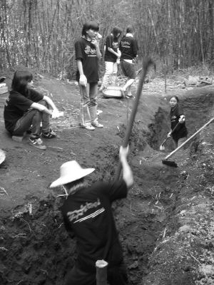 在村邊的一隅,林木茂盛,兩個(gè)泥工正在給一座"房子"抓緊封頂,一群青年志愿者們或是幫助傳遞泥漿,或是在屋邊挖掘水池,忙得熱火朝天,20多人穿著統(tǒng)一的T恤匯集成一片橙色的海洋。據(jù)了解,大學(xué)生剛駐村時(shí),看到村民還用"茅廁",為了培養(yǎng)村民的衛(wèi)生意識(shí)與習(xí)慣,改善村子環(huán)境衛(wèi)生,他們就幫助村民建造方便、衛(wèi)生、適用的公共廁所。經(jīng)過(guò)多方努力,他們籌措到資金1萬(wàn)多元。為促使工程早日竣工造福于民,他們天天駐守在陣地,揮汗如雨,無(wú)怨無(wú)悔地貢獻(xiàn)著熾熱的青春。
