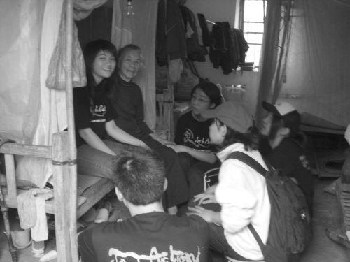 廣東省湛江市遂溪縣城月鎮(zhèn)園田村是麻風(fēng)病康復(fù)者群居的村莊。日前,該村迎來(lái)了30名中外大學(xué)生志愿者(日本大學(xué)生10名),他們來(lái)自日本早稻田大學(xué)、日本明治大學(xué)、中山大學(xué)、廣東工業(yè)大學(xué)、廣東商學(xué)院、廣東海洋大學(xué)等7所高校,成立了一個(gè)專門為麻風(fēng)康復(fù)者服務(wù)的"家--工作營(yíng)"。他們和麻風(fēng)病康復(fù)者一起食住10天,在這10天里,他們?yōu)槁轱L(fēng)病康復(fù)者做身體檢查,為他們整理房屋,修理家具等等,做著他們力所能及的事!而晚上則給麻風(fēng)康復(fù)者村的村民表演節(jié)目,用歌聲、舞姿給這些村民帶來(lái)歡笑!因?yàn)檫@些大學(xué)生的到來(lái),終于打破了麻風(fēng)康復(fù)者村長(zhǎng)久以來(lái)與外界的隔絕。有一天晚上,他們放映電影,吸引了十多個(gè)來(lái)自附近村莊的觀眾(非麻風(fēng)康復(fù)者村民),并且大學(xué)生們與麻風(fēng)康復(fù)者村村民一起吃、住10天,許多人明白到麻風(fēng)病并沒有傳說(shuō)中的可怕!