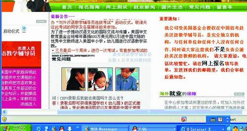 記者在該公司網站上看到,一方面公司宣稱:美國華文教育基金會將每年募捐600萬美元用以引進中國內地的優秀中文教師進入美國中小學、幼兒園進行漢語教學實踐活動,另一方面又發緊急通知,稱公司受“美國基金會”授權在中國招考赴美漢語教學輔導員。兩個基金會是什么關系,記者不得而知。