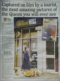 Queen Elizabeth walking her Corgie dogs to a betting shop on page 3 of the 01 April, 2004 edition of the London Daily Mail.