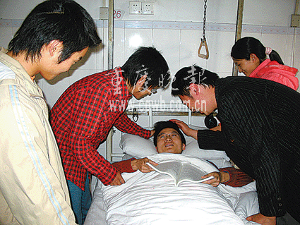 李天勇,河南新鄉市原陽縣人,西南大學食品科學學院04級包裝(2)班的才子———每年的獎學金獲得者、學校“職業技能先進個人”、校武協散打高手。從2004年9月入學起,身為貧困生的他被推薦做教學樓清潔,每月200元。去年12月,李天勇在清掃樓道時,突覺脊椎針扎一樣痛,疼痛迅速蔓延至髖骨、胸部。一陣天旋地轉后,他倒在地上,四肢僵硬,脊柱強直,全身冰涼,儼然一具“僵尸”。