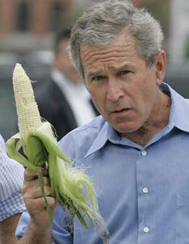 President George W. Bush holds an ear of raw sweet corn that he ate on a