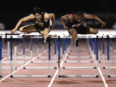 Xiang (L) of China edges out Terrence Trammell (R) of the US in the men's