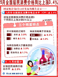 | 國家統(tǒng)計(jì)局發(fā)布的最新統(tǒng)計(jì)顯示,由于5月份全國范圍內(nèi)肉蛋價(jià)格出現(xiàn)較大幅度上漲,直接導(dǎo)致了當(dāng)月居民消費(fèi)價(jià)格指數(shù)(CPI)同比上漲3.4%,該數(shù)據(jù)創(chuàng)下兩年以來的新高。統(tǒng)計(jì)顯示,5月份居民消費(fèi)價(jià)格上漲的主要?jiǎng)恿碓从谑称奉悆r(jià)格的較快上漲,5月食品價(jià)格較上年同期上漲8.3%。 |