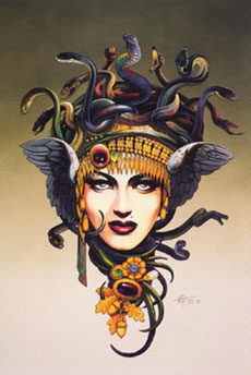 她居住的洞穴中堆滿了試圖接近她的人的尸骨。后來,一位年輕的英雄珀爾修斯殺死了美杜沙,他與美杜沙搏斗時盯著的是她在水中的倒影,這樣一來就躲過了因為看到美杜沙的眼睛而被變成石頭的情況的發生。他隨身攜帶自己的戰利品,經常在敵人面前把它拿出來,嚇退他們。