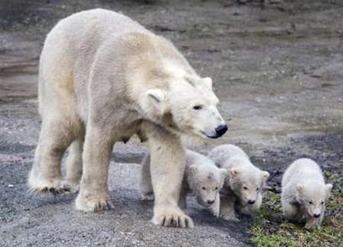 Polar bear cubs and their mother Huggies are placed on public display at the Ouwehands Zoo in Rhenen, the Netherlands March 10, 2006. It is the first time a polar bear in captivity has given birth to triplets, the zoo said.(Reuters)