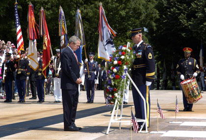 U.S. President George W. Bush (center L) bows his head after laying a Memorial Day wreath at the Tomb of the Unknowns at Arlington National Cemetery near Washington May 29, 2006. Assisting is an unidentified military honor guard member. (Reuters)