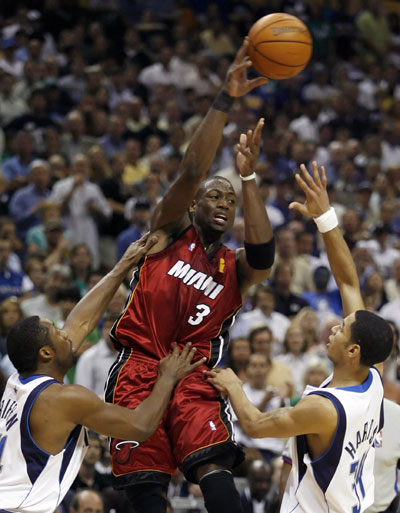 Miami Heat guard Dwyane Wade passes the ball against Dallas Mavericks' Adrian Griffin (L) and Devin Harris during the second half of Game 6 of their NBA Finals basketball game in Dallas, Texas, June 20, 2006. (Reuters)