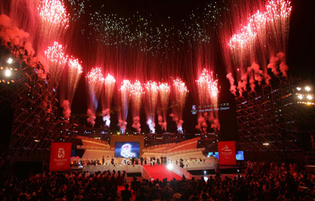 People watch a fireworks display during a ceremony at the foot of the Great Wall's Badaling section, near Beijing, September 6, 2006. Fu Niu Lele, the official Mascot of the Beijing 2008 Paralympic Games, was unveiled Wednesday night to mark the two-year countdown to the opening of the Paralympic Games. (Reuters)