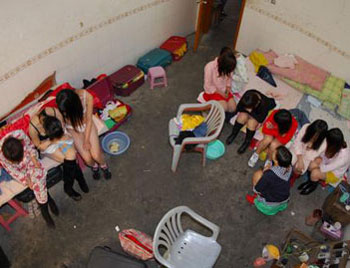 Strippers duck their heads at a room in Nan'an, Southeast China's Fujian Province December 3, 2006. The local police have busted astriptease performancewith dozens of elderly audience involved in. Most of the audience are up to 60 with the oldest 82. Strippers and organizers have been given a 15-day detain and a fine of 1000 yuan