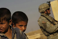 Two Iraqi chidren and a US soldier.