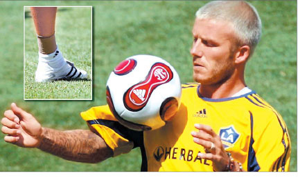 David Beckham trains at his first official soccer practice session for the Los Angeles Galaxy at their stadium in Carson, California on Monday. Inset: The injured left ankle of Beckham is seen as he trains on Monday.