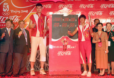 China's NBA super star Yao Ming and Olympic 110m hurdles champion Liu Xiang attend Coca Cola's launching ceremony of the plan for one-year countdown to Beijing Olympics in Beijing August 8, 2007. [Xinhua]
