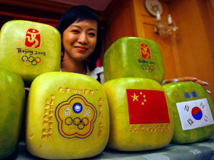 A television reporter poses for photographers with square watermelons carved with the Beijing 2008 Olympic logos, China's flag and South Korea's flag during a news conference by the Chinese Agricultural Association (CAEA), in Taipei October 17, 2007. CAEA said on Wednesday that supermarkets in mainland China and Taiwan have ordered around 50,000 square watermelons which cost about 200 TWD ($6) each to produce. (Reuters)
