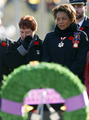 Silver Cross Mother Wilhelmina Beerenfenger-Koehler (L) reacts while standing with Canada's Governor General Michaelle Jean after laying a wreath during Remembrance Day ceremonies at the National War Memorial in Ottawa November 11, 2007. Beerenfenger-Koehler's son, Corporal Robbie Beerenfenger, was killed near Kabul, Afghanistan in October 2003. Beerenfenger-Koehler was named the Silver Cross Mother to represent all mothers who lost children in the military. (Agencies)
