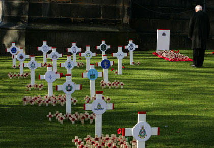 A war veteran looks down at crosses placed in the ground on Armistice Day in Princes Street Gardens in Edinburgh, Scotland November 11, 2007. People across Britain observed a two-minute silence to remember the nation's war dead on Sunday. (Agencies)