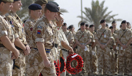 A handout photograph shows senior officers from the Multi National Division stepping forward to lay wreaths during a Remembrance Sunday parade in their contingency operating base (COB) in Basra, Iraq November 11, 2007. A service was held at the base on Remembrance Sunday, when the sacrifices made by Britain's war dead were commemorated. (Agencies)