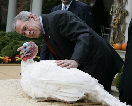 US President George W. Bush pardons "May", the 2007 National Thanksgiving Turkey, during a ceremony in the Rose Garden of the White House in Washington November 20, 2007. US presidents traditionally grant the turkey a "pardon", after which it is flown first class to Disney World in Orlando for a Thanksgiving Day parade. (Agencies)